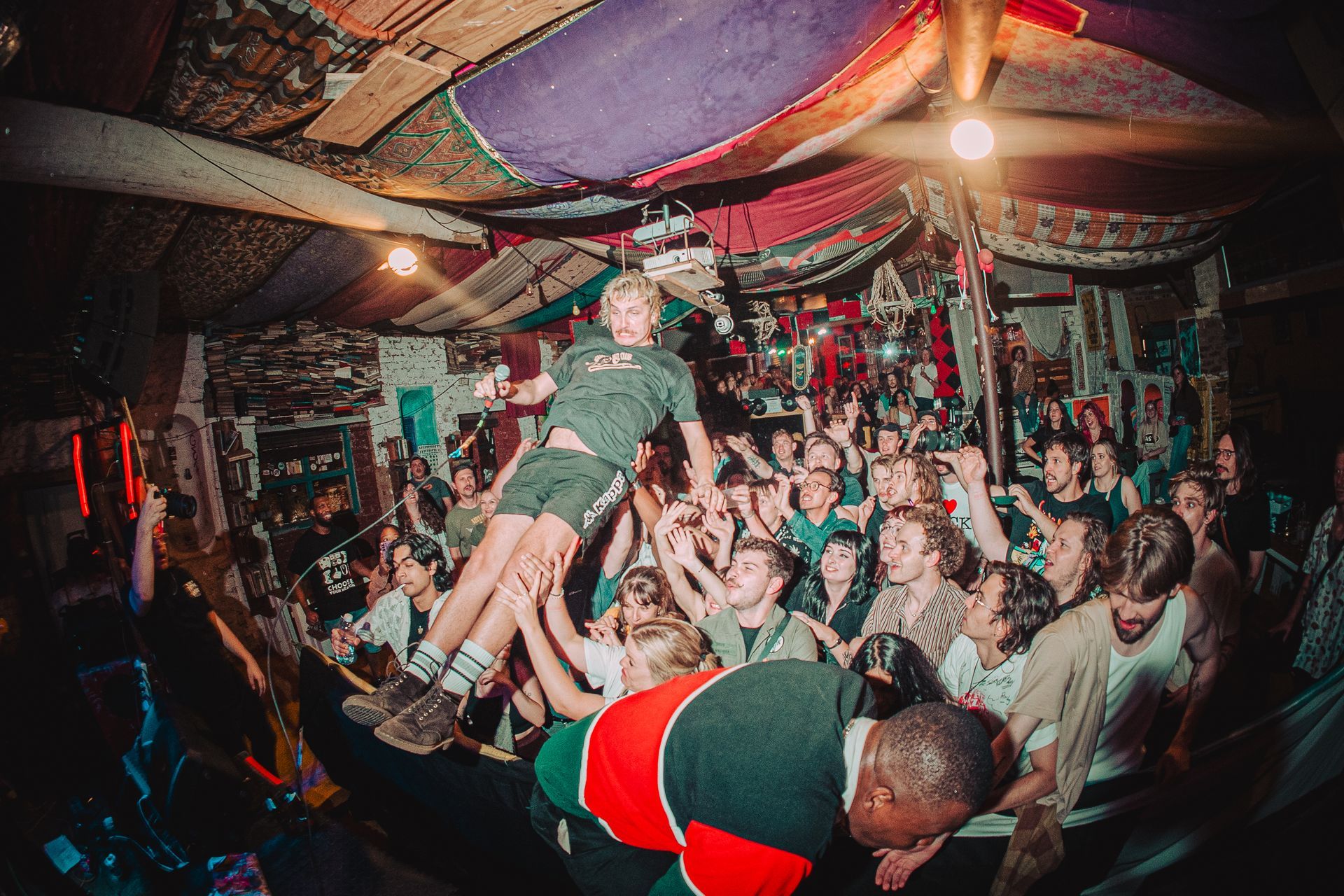 Cloudsurfers’ second album Subhuman Essence – out September 15 2023 – is a daredevil attempt to match the group’s boisterous stage hijinks on record. There’s a feverish, festering energy permeating through these ten tracks, channeled through five individuals like a jolt of lightning. Instead of tracking and layering the instruments separately, producer (and surrogate audience member) Abel de Grefte insisted the band would lay down the tracks live in the control room, letting all the signals and energies smolder into each other. With the risk of one member fucking up ever-present, each take was a high-stakes affair – a full-throttle dart into the eye of a storm – and that awesome wave of relief washing over after nailing it.